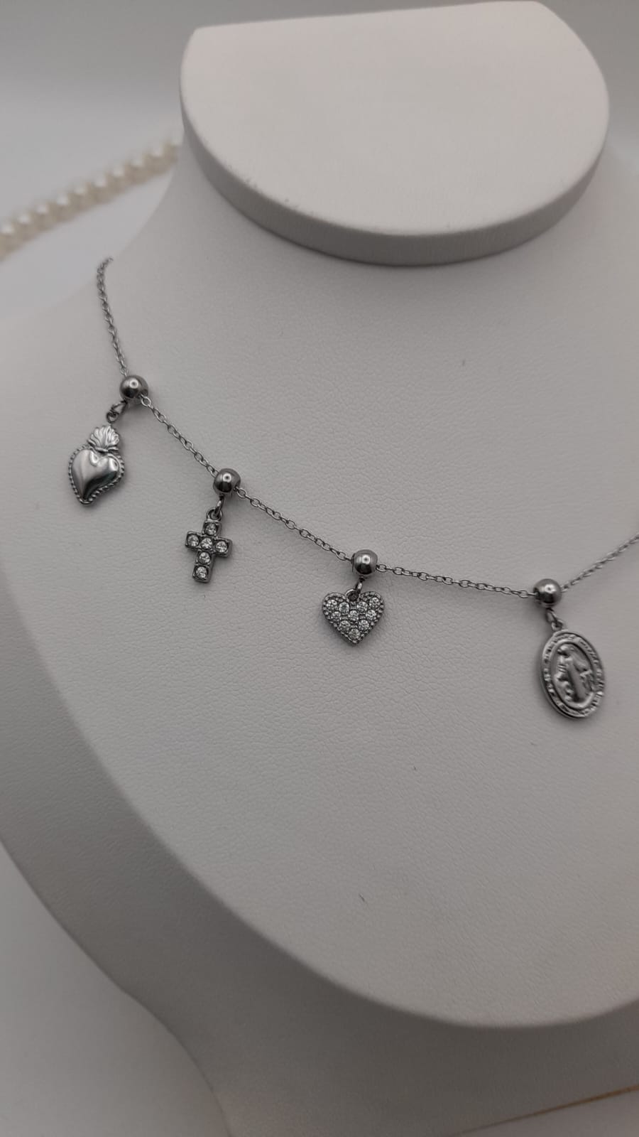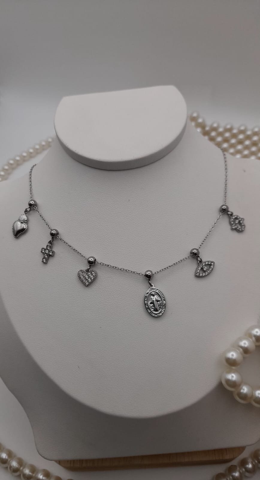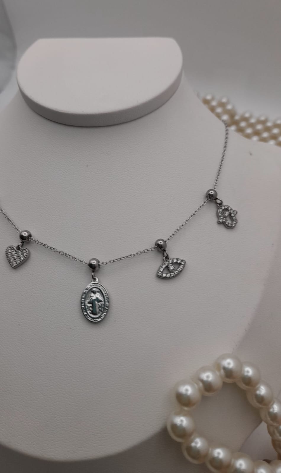 Collana a strozzo Roma con ciondoli cuore sacro, crocetta, cuoricino, madonnina miracolosa,occhio portafortuna e mano di Fatima .