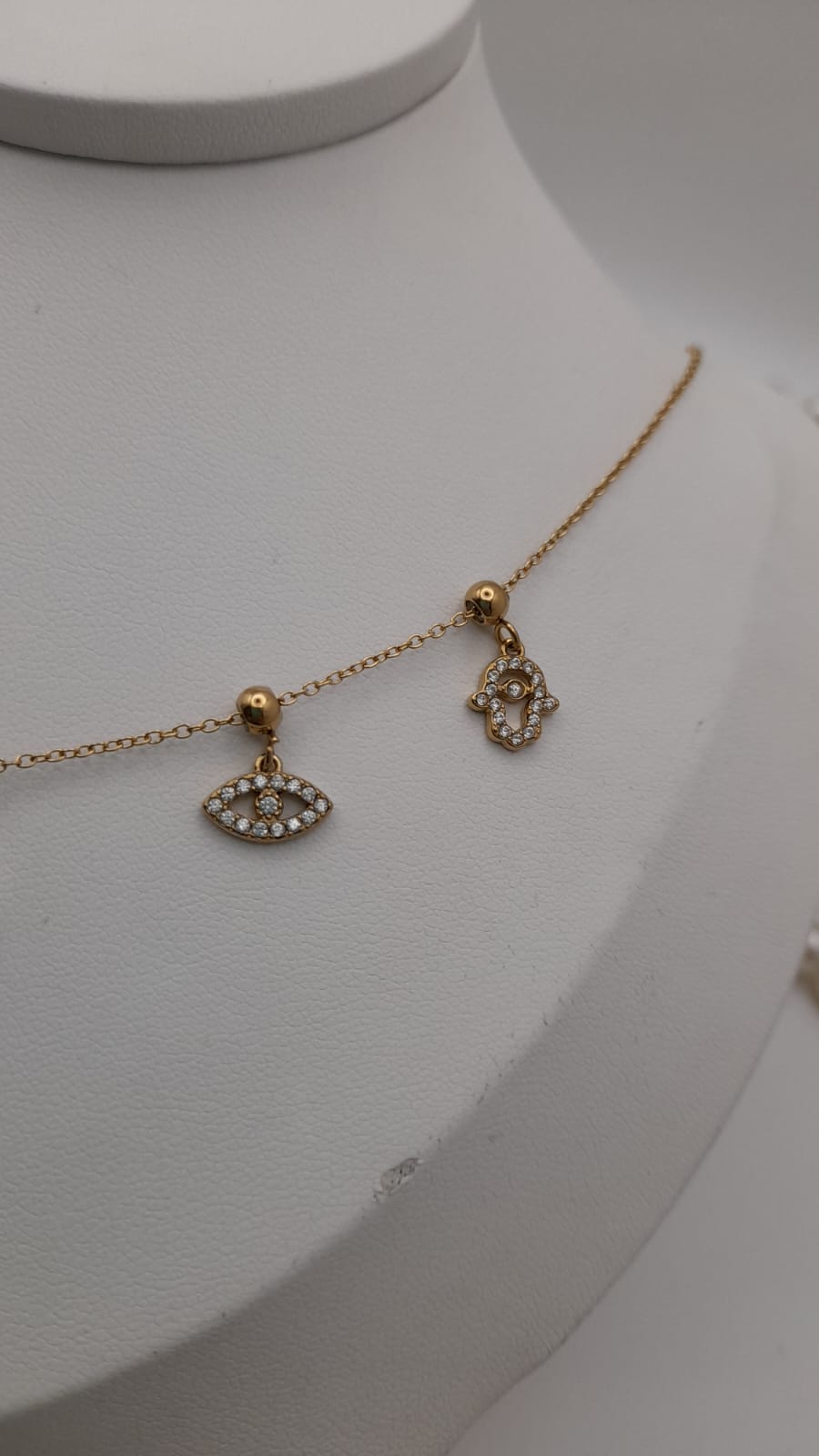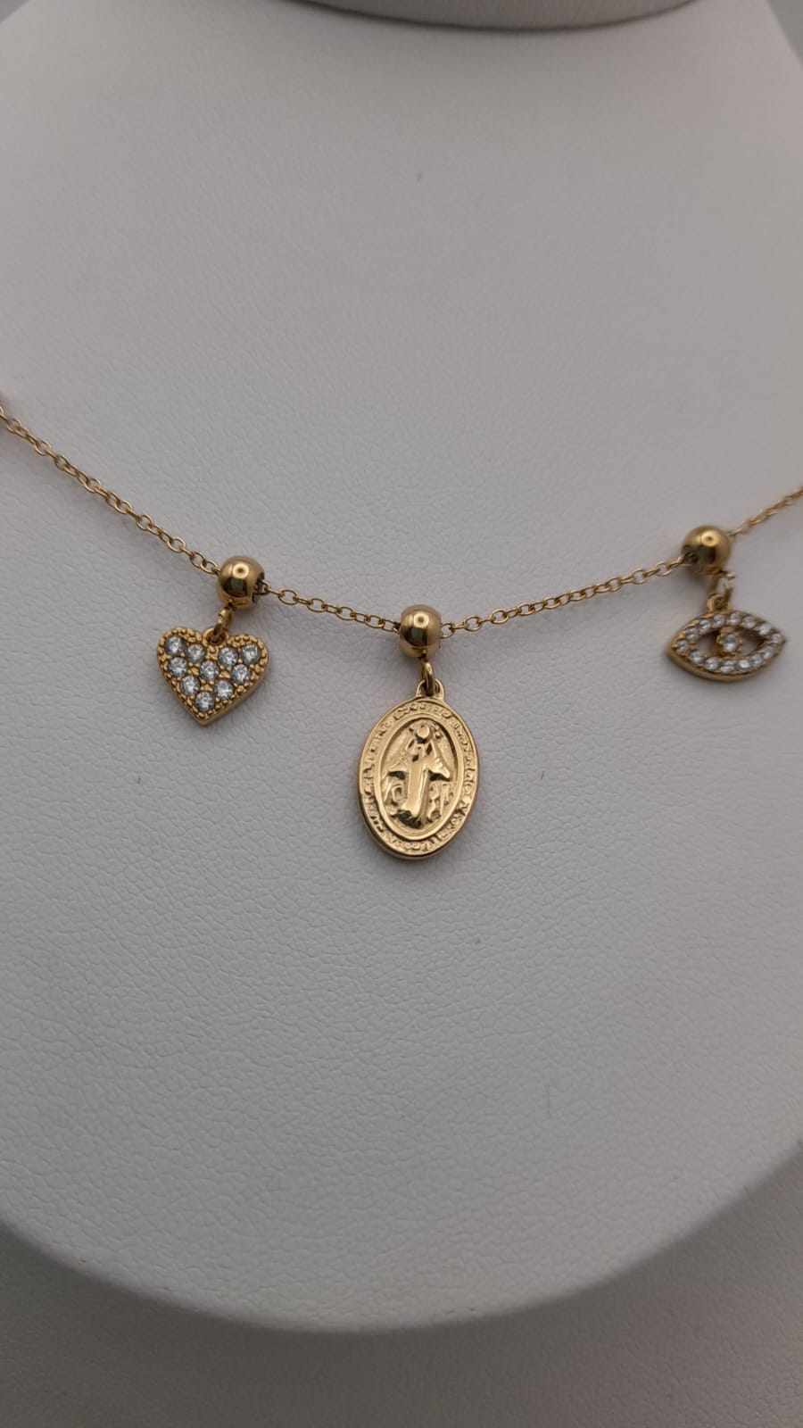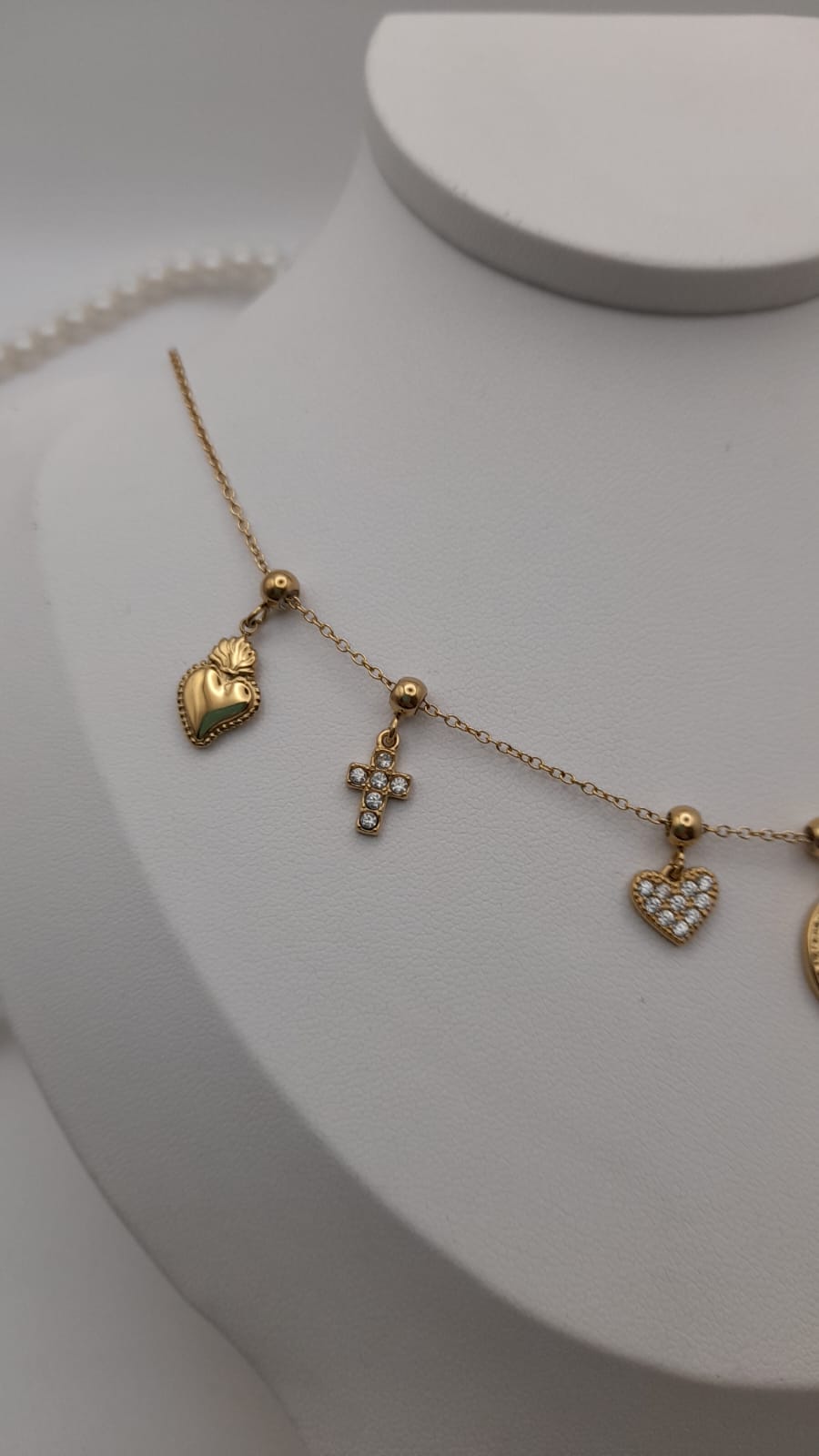 Collana a strozzo Roma con ciondoli cuore sacro, crocetta, cuoricino, madonnina miracolosa,occhio portafortuna e mano di Fatima .